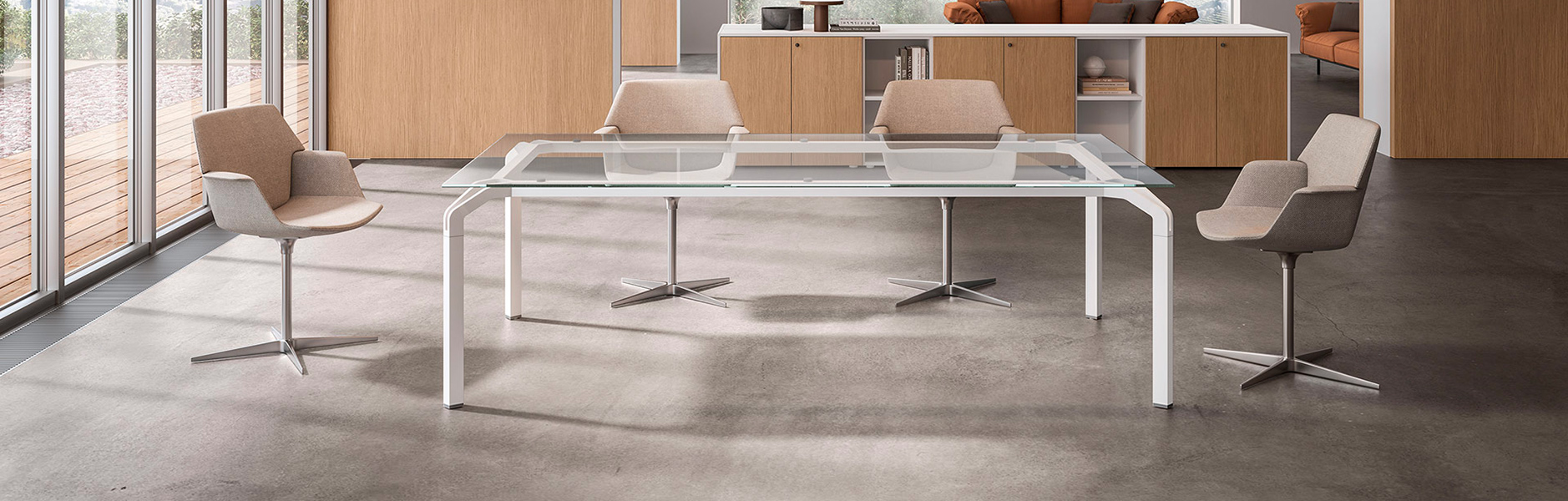 Per uffici direzionali un tavolo in vetro e legno unisce design e autorevolezza.